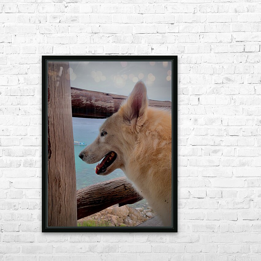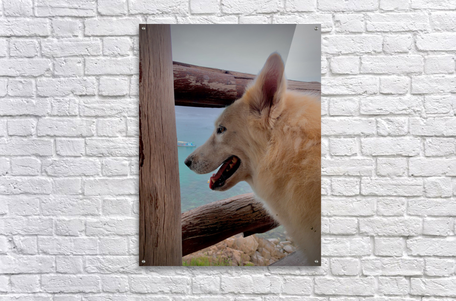 Get this artwork "Beatiful White Dog Looking at the Sea" in a framed print.